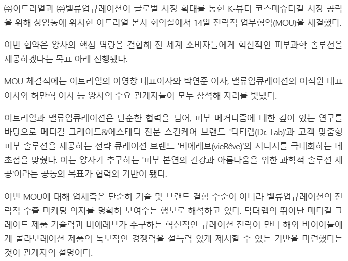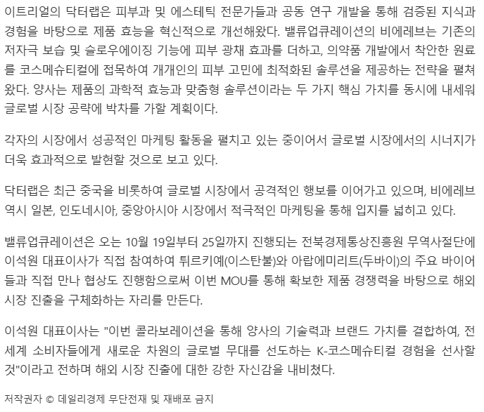 [데일리경제]'닥터랩’ 이트리얼과 '비에레브' 밸류업큐레이션 업무협약 '글로벌 코스메슈티컬 시장 공략'