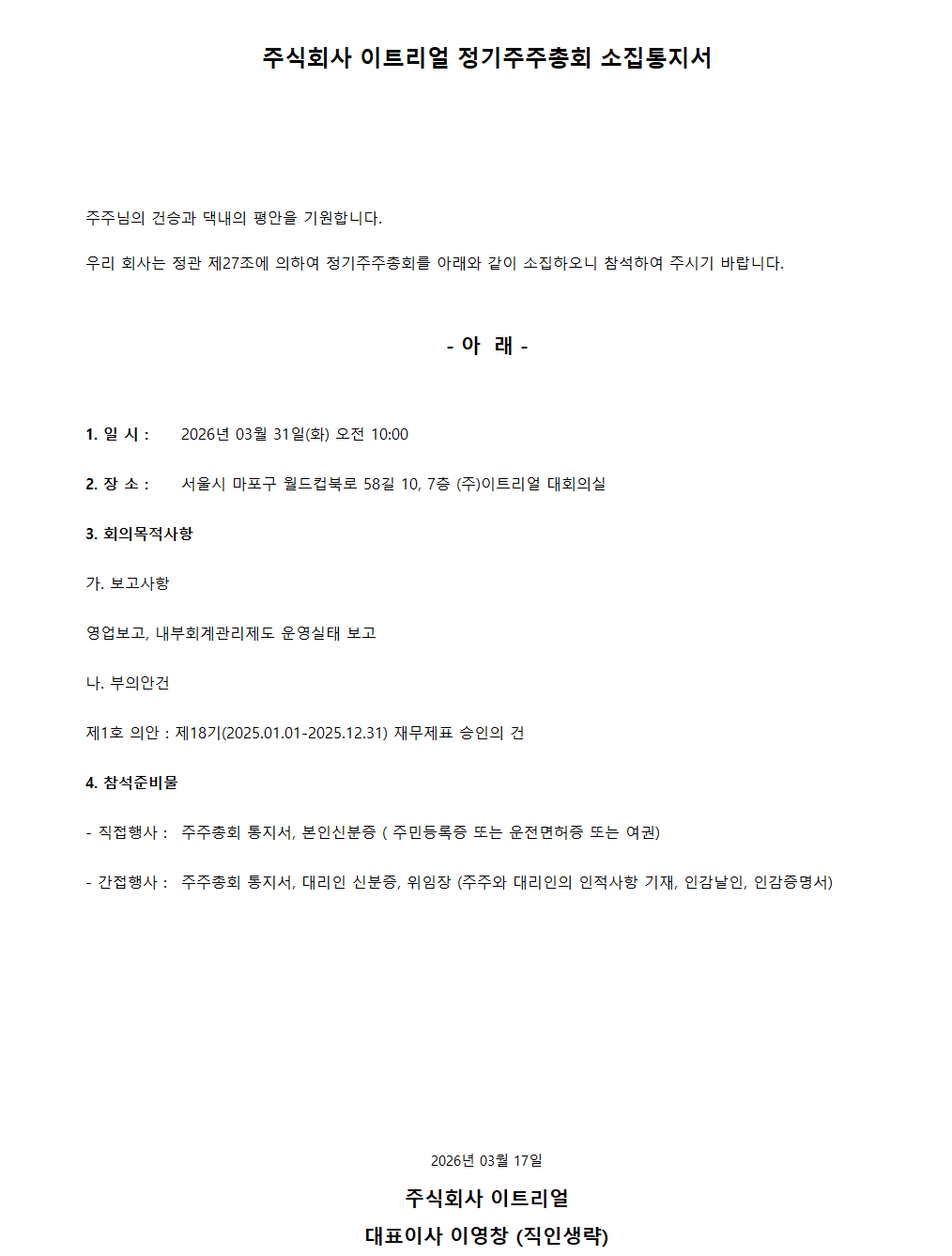 2026년 03월 31일 정기주주총회 소집통지서